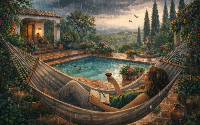 Her mind returned briefly to her younger self just as the first drop of rain landed on her skin. The splat jolted her fully back to the present, along with the unmistakable tones of Bye Bye Baby. She considered reaching for her audiobook to drown out the noise, but her lazier side won. Instead, she lay back further and pretended she was part of the neighbour’s party. Raising her glass, the wine missed her lips, landing squarely on her chest thanks to the gentle sway of the hammock. It was her third glass, which made the whole situation feel that bit more bearable. She glanced towards the porch where her husband sat, quietly reading, a glass of their mutually favourite red wine in hand. She smiled, feeling a surge of something close to awe.